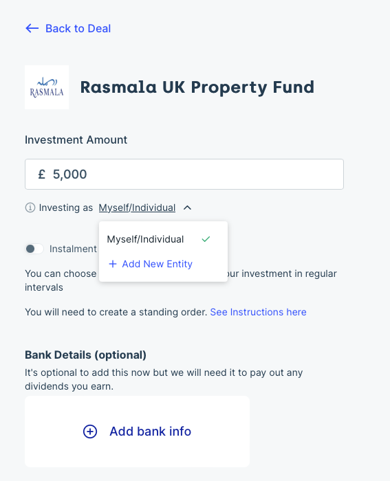 3.) Once you are taken to the investment page beneath investment amount box there is an option to select whether you are investing as an individual or as an entity. Click the underlined term and a menu to select individual, an existing entity you have registered, or register a new entity will appear.